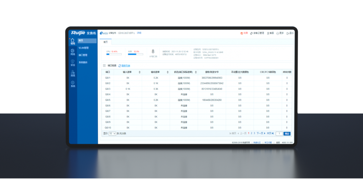 | 管理特性 | SNMP、CLI(Telnet/Console)、RMON、SSH、Syslog/Debug、NTP/SNTP、FTP、TFTP、Web、WIS公有云平台管理 | |