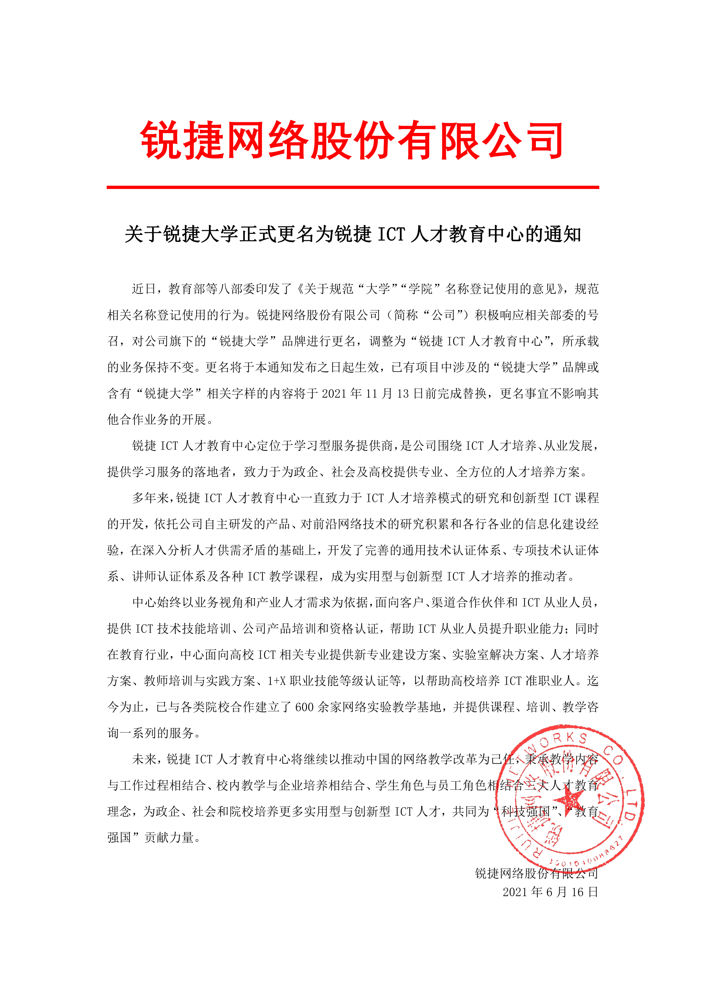 作为业界先进的厂商级网络技术教育培训机构,锐捷ICT人才教育中心多年来,一直致力于网络人才培养模式的研究和创新型网络课程的开发,依托锐捷网络自主研发的产品、对前沿网络技术的研究积累和各行各业的信息化建设经验,在深入分析人才供需矛盾的基础上,开发了完善的通用技术认证体系、专项技术认证体系、讲师认证体系及各种网络教学课程,成为实用型与创新型网络人才培养的推动者。锐捷ICT人才教育中心以推动中国的网络教学改革为己任,与各类院校合作建立600余家的网络实验教学基地,并提供课程、培训、教学咨询一系列的服务。